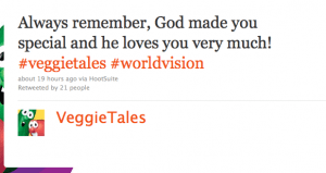 We had SO much fun at the Veggie Tales World Vision Twitter party! I hope you were able to chat with us. We talked about the real meaning of Easter, our favorite Silly Songs and of course, child sponsorship. We gave away prizes but a few people said they felt like everyone won because of the great conversation! Truly, it was a blast!